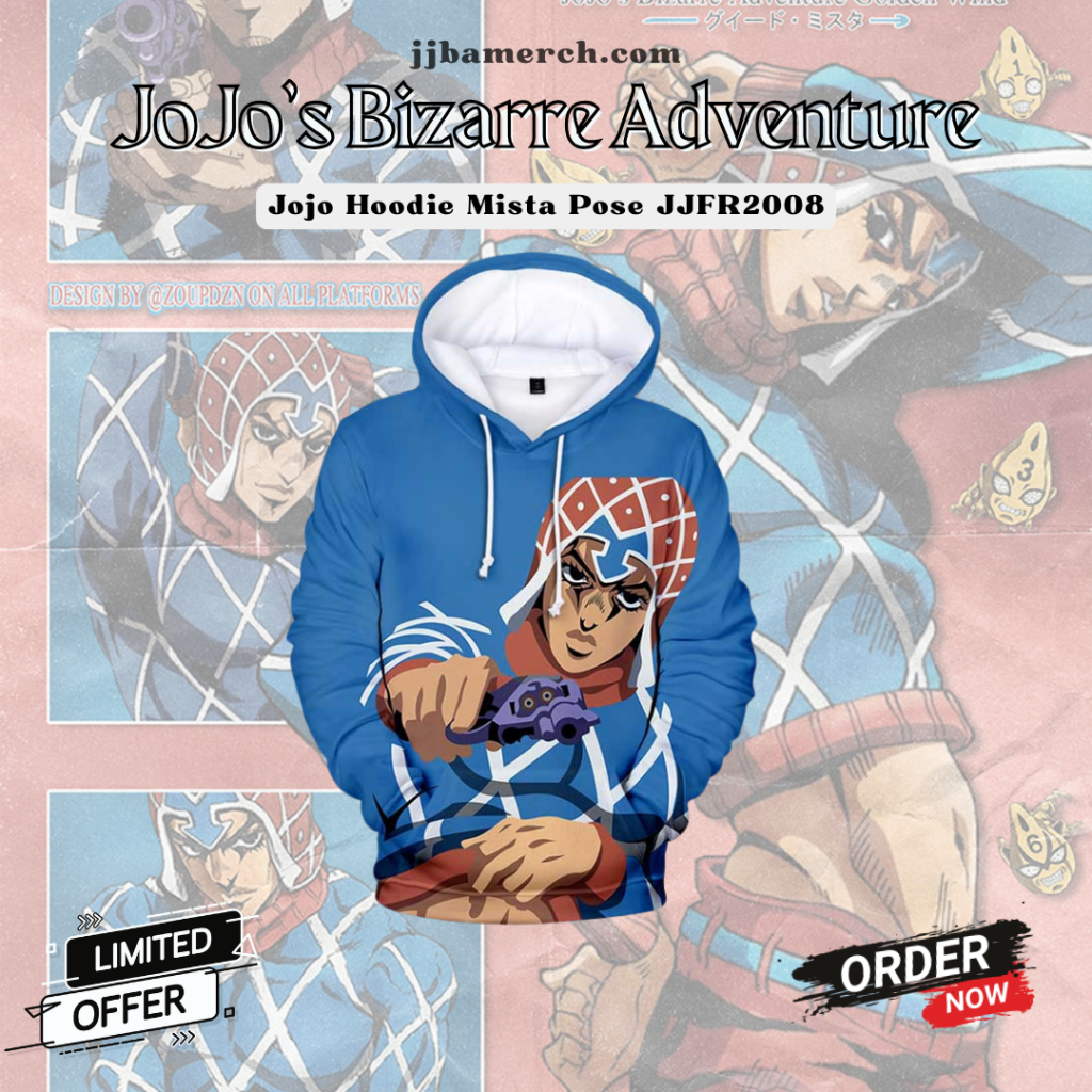 Rock your style with this JoJo’s Bizarre Adventure Hoodie, featuring the iconic Mista pose from JoJo fame. Perfect for fans who love bold anime fashion and unforgettable character energy.